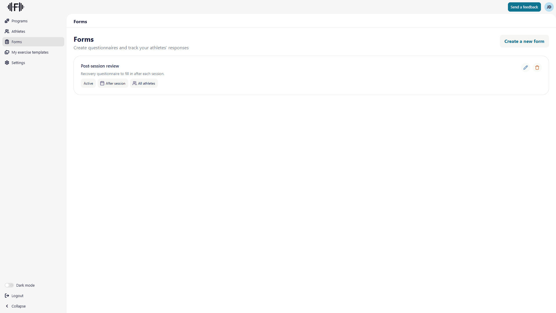 From your coach dashboard, go to the Forms section in the sidebar. Click Create a new form to open the creation dialog.