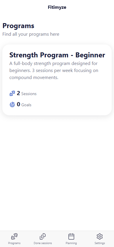 Log in to your Fitimyze account. You land directly on the Programs page, which lists all the programs your coach has assigned to you.