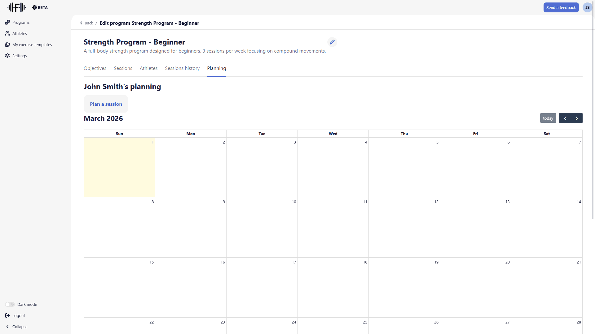 The Planning tab lets you attach program sessions to specific dates, and adapt the session for a specific date. Your athletes then see these sessions in their space and can start them directly from their planning, without having to browse through the full program list.